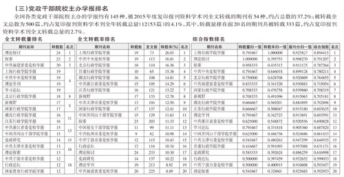全国各类党政干部院校主办的学报约有145 种,被2015 年度复印报刊资料学术刊全文转载的期刊有54 种,约占总数的37.2%;被转载全文总数为500 篇,约占复印报刊资料学术刊全年转载总量(12153 篇)的4.1%,其中,转载量排在前20 名的期刊共被转载333 篇,约占复印报刊资料学术刊全文转载总量的2.7%。