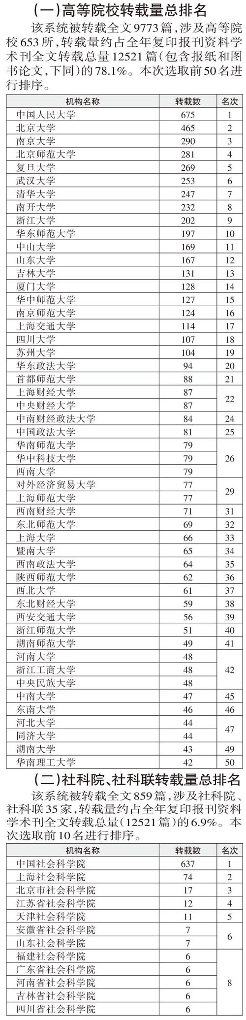 该系统被转载全文9773篇,涉及高等院校653所,转载量约占全年复印报刊资料学术刊全文转载总量12521篇(包含报纸和图书论文,下同)的78.1%。本次选取前50名进行排序。