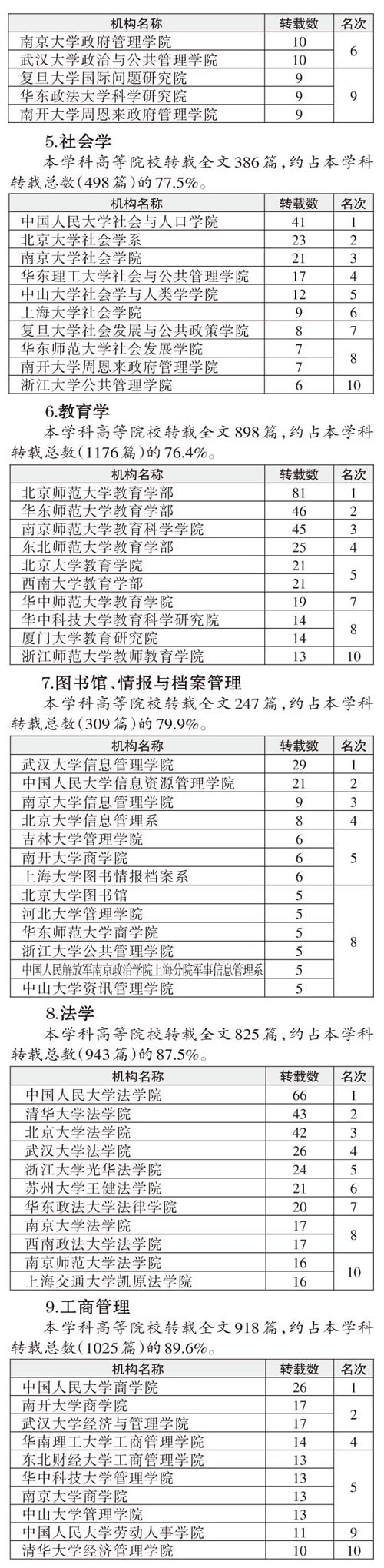 本学科高等院校转载全文825篇,约占本学科转载总数(943篇)的87.5%。