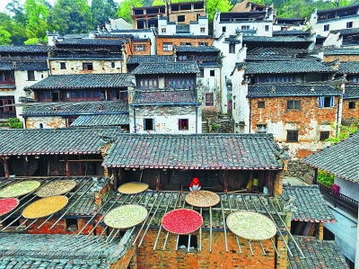 目前正是江西省婺源县篁岭景区最美的时节,凭借油菜花梯田、徽派民居,以及心形梯田湖等诸多元素,篁岭吸引了大批游客前来游玩。图为篁岭景区内,一位当地居民在晾晒食物。