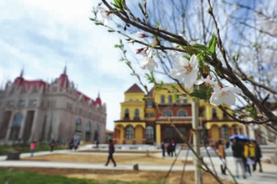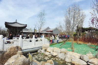 4月2日,游客在风景如画的唐山世园会河北园内赏花拍景。
