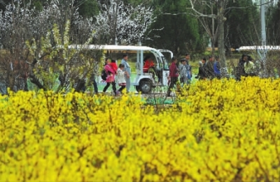4月2日,游客在唐山世园会鲜花盛开的龙山下游览秀丽景色。