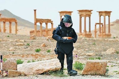 4月10日,俄罗斯国防部公开发布了俄工兵在著名的帕米拉遗迹扫雷图片。俄国防部官方发言人此前披露,叙利亚恐怖分子在撤离帕米拉前曾在近180公顷的土地上布设了雷区。历史悠久的帕米拉遗迹是被列入联合国教科文组织《世界遗产名录》的六大世界遗迹之一。该城2015年5月中旬被叙恐怖分子占领。叙利亚政府军3月27日宣布占领帕米拉的恐怖主义武装已被清除。本报驻莫斯科记者 汪嘉波供图