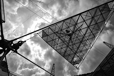 4月10日,工作人员在安装500米口径球面射电望远镜(FAST)工程反射面面板。截至4月10日,正在贵州省平塘县建设的射电望远镜已完成4185块反射面面板安装,完成比例达94.04%。