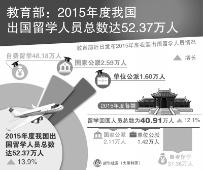 2015年3月,教育部发布统计数据称,2014年中国出国留学人员总数达45.98万人,比2013年增加了4.59万人,涨幅达11.09%。2016年3月,教育部发布《中国留学回国就业蓝皮书2015》称,2015年出国留学人数已达52.37万人。从留学生的分布来看,在北美,学生主要集中在美国;去欧洲的学生主要流向英国;而大洋洲则主要聚集于澳大利亚。中国早已是美国、英国和澳大利亚最大的国际学生生源地。