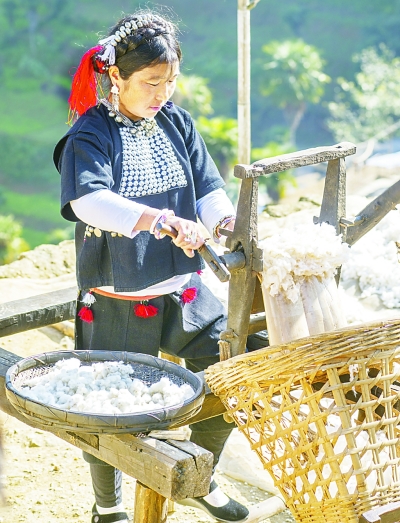 哈尼山寨的纺织完全由妇女承担。从采棉花开始,我用一段时间记录了哈尼服饰制作的过程,包括晒棉花、轧棉花、弹棉花、搓棉条、捻线、纺线、绕线、纺纱、煮纱、织布、靛染、缝制衣裳等一系列传统纺织技术工序。棉花是天造地设的布衣原料,和丝、麻、皮、毛一道,轻轻挑起了人世冷暖的重担。大约在南北朝时期,棉花从印度和阿拉伯跋山涉水来到中国,以朴实和温暖的花朵,率先在滇南边陲丰满绽放,讲述着“道法自然”的岁月冷暖。哈尼族是我国最早种植棉花的民族之一。