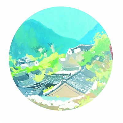 就这样,我在村里完成了这组写生——《蓝·心》,以蓝为主色调,构思来自于这个古村,画得顺手又顺心。以前我总是想去融入当地一个新鲜的环境从而还原它本身的样貌,但这次我是以一个外来者的视角,一个古村落中外来的元素,去窥视这个不曾见识过的地带。我抛开了理性去创作,虽然完全的感性让这组画少了许多细节,但增添了更多的表现力。天空的色彩,是我对这村子的最简单直接的印象,这是我过滤过的蓝,是我细细品味古村的每个时刻之后,永远凝固在脑海的蓝。不论是仰望的山腰、俯瞰的村落、干净的石板道还是静谧的庙宇,它们都是这片蓝天下的美好。这是我最从心的一组作品,它完全表达了自己的心,即使它从不像我之前的任何一件作品那样来得工整和技巧。