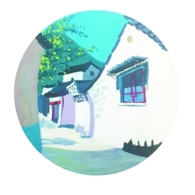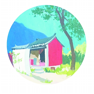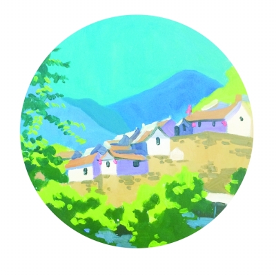 村子不大,除了少许偏僻或较高的老宅子未被涉足,饭后随便走走也就大致逛完了。我决定在这个第一眼并不深爱的村落里寻找它的美。晚饭过后,大部分游客的离去让村子剥落了城市化的外衣,渐渐呈现出原来的本貌。傍晚与几个朋友相约登高,村子朦朦胧胧,星星点点的灯光如萤火虫一般,树上的知了叫声变得清脆许多,不像中午般的聒噪,远处两三家炊烟也挨个儿冒出,飘扬,散开。我阔步回到住所,赶紧翻出画框,特意挑了圆形的画框,拎着油画箱就回到了高处的平台。是这一片夕阳的爱抚让脱下外衣的小村露出了自然的模样,是此时蓝天的羞涩染红了村落的墙面,照耀在大地,暖进我心里。笔在画布上迅速地划过,在追逐夕阳与小村的这场邂逅,在窥视它们之间自然的交流,在偷偷地记录这角落片刻的小幸福。