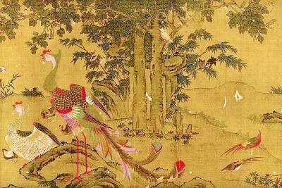 在现今所能见到明确以凤鸟为主题的绘画作品中,首推明代宫廷花鸟画家边景昭的《百鸟朝凤图》长卷。画家笔下的凤凰,栖于画面中间偏右的梧桐树下昂首挺立,孔雀、白鹤等百鸟拜伏,并穿插以树石、花草与流水。整个画面工谨秀丽,精妍端庄,显示出画家对于南宋院体花鸟画传统的继承与发展。清人杜瑞联在《古芬阁谈画记》中谈及边氏的《五伦图轴》时曾说道:“论曰:宋画院以五伦图试士,人多作人物,唯一士画凤凰取君臣相乐之意……景昭此图,盖仿宋本也。”看来,以“百鸟朝凤”象征君臣亲爱的做法至少在宋代就已经出现。不过,清代画家沈铨却通过自己的创作打破了这种礼教的束缚。一生追求精丽画风的他,似乎只在意竭尽所能表现凤凰的华美。而他的这种画风深深影响到了当时乃至后来的日本画坛。