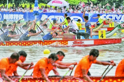 6月8日、9日,2016中华龙舟大赛(福建·福州站)在福建省福州市浦下河龙舟池举行。本次赛事共有22支队伍参赛,分别进行标准龙舟和传统龙舟比赛,由国家体育总局社会体育指导中心、中央电视台体育频道、中国龙舟协会、福建省体育局、福州市人民政府主办。右图为运动员在8日的比赛中奋勇争先。
