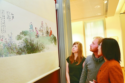 《和乐》“感知中国文化·体验魅力上海”城市形象推广活动日前走进比利时。以展现中国古代贤哲思想为主题的“诸子百家国风画展”及由上海摄影师拍摄的“魅力上海摄影展”同时在布鲁塞尔中国文化中心举行。画家郭德福先生将孔子与比利时著名动漫人物丁丁、斯皮鲁和蓝精灵绘制在一起,让他们“穿越时空相聚”,展现了文化的力量。图为参观者在欣赏郭德福先生的画作《和乐》。
