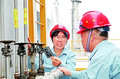 图为张恒珍在装置分离区现场检查设备运行状况。柯裕清摄/光明图片