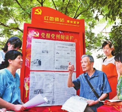 日前,安徽省合肥市包河区包公街道理论宣讲“红色驿站”正式启用。街道党员邀请中宣部基层理论宣讲先进个人杨泽田(中),来到“红色驿站”讲党课。徐勇摄/光明图片