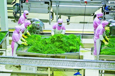近年来,山西省右玉县引进企业建设蔬菜种植基地,发展小香葱产业,以产业扶贫带动农民创收。种植基地占地3500亩,年产小香葱300多吨,每天有近千位农户在此工作。图为7月1日,图远实业有限责任公司的工人在车间进行小香葱的清洗、切割作业。本报记者 马列摄/光明图片