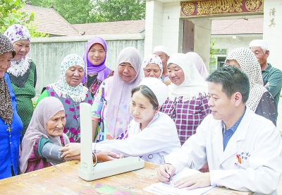 近年来,江苏丰县充分发挥党组织的先锋模范作用,针对基层医疗服务能力薄弱的实际,组织1200多名党员医务工作者到村组,通过义诊、捐赠、调研等活动,精准解决偏远村“医疗贫困”现状。图为6月6日,丰县欢口镇卫生院党员医务工作者为苏鲁边界偏远的少数民族村——黄店回民村村民进行健康体检。高荣光摄/光明图片