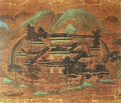 图为王维《辋川图》摹本的局部。这幅画很特别,构图是不多见的圆环形,这并不是王维标新立异,而是他对自己长期居住的陕西辋川形貌相对真实的写照——水环山抱如辋。王维对辋川很有感情,不仅画过《辋川图》,还写过《辋川集》,《鹿柴》《竹里馆》均出自《辋川集》。