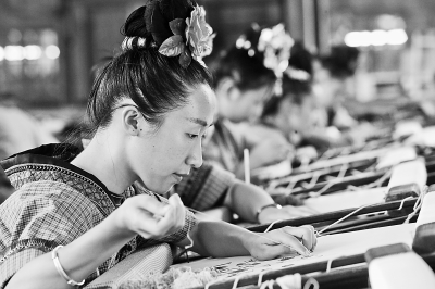 日前,二〇一六中国(贵州)国际民间工艺品博览会在贵州凯里举办。借助博览会,凯里积极展示独特的苗侗民族文化,促进文化旅游产业快速发展。图为身着民族服饰的绣娘展示刺绣技艺。本报记者 赵洪波摄/光明图片