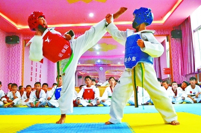 7月27日,留守儿童在湖北省十堰市郧阳区某运动中心习武健身。近年来,随着全民健身意识不断提高和当地阳光体育运动的全面深入,越来越多的农村留守儿童选择在拳馆习武健身,磨炼意志度暑假。杨显有摄 光明图片