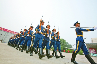 7月29日,“讲好强军故事”主题采访活动在中国人民解放军三军仪仗队正式启动。活动由中央军委政治工作部宣传局组织,旨在讲述中国军队故事,展示中国军队形象。图为三军仪仗队正在进行训练展示。本报记者 陈茵摄/光明图片