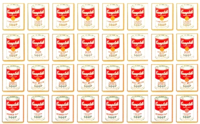 “我认为艺术不是为挑选出来的少数人服务的,”沃霍尔说,“我认为它应该服务于美国大众。”像其他波普艺术家一样,沃霍尔使用了那些已经在众多的观众中深入人心的形象:连载漫画、广告、摇滚乐手和电影明星的照片,以及轰动性的新闻照片。在《坎贝尔汤罐头》当中,他以最直白的方式对一种大众消费品进行了复制。当他第一次展出这些画的时候——共有32幅,与当时坎贝尔出售的32个罐头品种数量相同——每一个都同时挂在墙上,像一幅画,或者放在架子上,像杂货店中的商品。