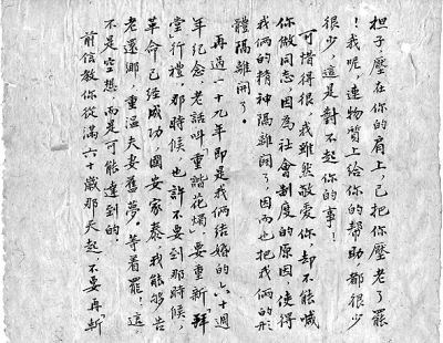 儿子要看父亲,父亲也想看看儿子,是人情之常。刻下你们很穷,北方是荒年,饿死人;你们筹措路费不易,到这里,我又替你们搞吃的住的,也是件麻烦事。如你们还没起身,可以等我一下,等到今年秋收后,估计那时候光景会好一些。到那时来看我,是一样的。打听便车是没有的。因为任何人坐车,都要买票。你们会说我这个官是“焦官”(湖南方言,指不挣钱的官)。是的,“官”而不“焦”,天下大乱;“官”而“焦”了,转乱为安。有诗一首:你们说我做大官,我官好比周老官(奇才大老官);起得早来眠得晚,能多做事即心安。