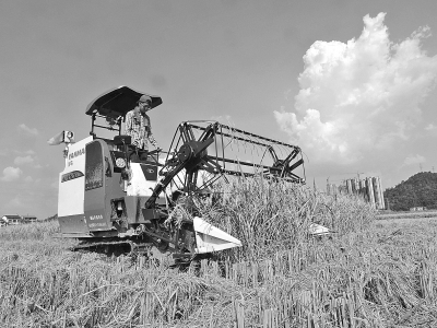 日前,四川省达州市渠县渠江镇农民在田间收获稻谷。金秋时节,该地100多万亩水稻已全面开镰。沉甸甸的稻穗将稻田染黄。稻谷飘香,一派丰收美景令人陶醉。邓良奎摄/光明图片