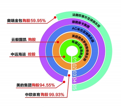 5日,中欧体育投资管理公司宣布与意大利菲宁维斯特公司完成签约,斥资7.4亿欧元收购意甲豪门AC米兰足球俱乐部99.93%股权。同一天,云毅国凯(上海)体育发展有限公司宣布收购英超西布罗姆维奇俱乐部控股公司。奥瑞金包装股份有限公司则宣布以700万欧元价格收购法国欧塞尔足球俱乐部59.95%的股权。
