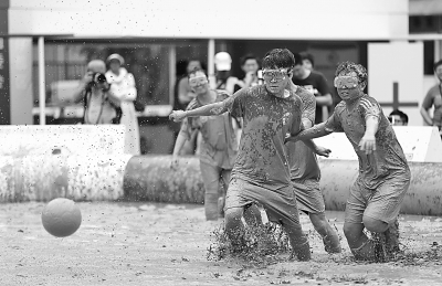 近日,“2016年泥浆足球中国赛”在北京市西城区月坛体育场举行。泥浆足球是一项起源于欧洲芬兰,在英国发展壮大,风靡全球的娱乐体育项目。2011年引入中国,至今已成功举办了五届泥浆足球赛。图为两队球员在泥浆中角逐。