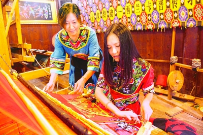 8月14日,重庆市级非遗传承人左翠平(左)展示“土家织锦”纺织技艺。近年来,重庆酉阳利用桃花源、龚滩古镇等景区的桥梁纽带作用,推进非遗文化和旅游产业的融合发展。