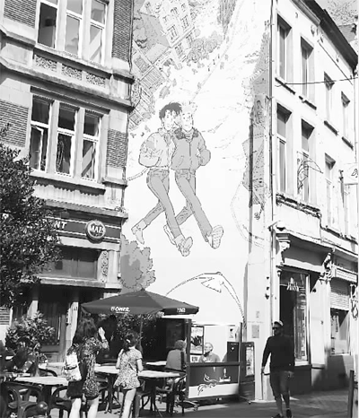布鲁塞尔不仅漫画家云集,每年出版大量漫画作品,而且老城区有数条“漫画旅游线”——漫画家们将著名的漫画人物、场景绘制在路口街角,甚至地铁站的墙面上,最长的一幅达60多米,气势恢宏。游客可以“按图索骥”,穿街过巷,常常能够惊喜连连,既体验了布鲁塞尔的风俗民情,又感受了“欧洲之都”浓郁的文化氛围。图为游客正在布鲁塞尔的漫画墙前留影。本报驻布鲁塞尔记者 刘军摄/光明图片