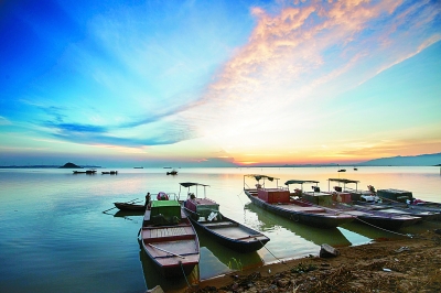 日前,江西省鄱阳湖都昌县矶山水域晚霞满天,云霞绚丽,渔民摇着小船驶过水面。近年来,江西加大湖区生态环境保护力度,启动湿地修复等多项措施恢复鄱阳湖生态系统,让鄱阳湖真正成为“一湖清水”。