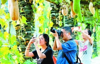 9月1日,江西省婺源县瑶湾景区,一条全长约100米的瓜果长廊,吸引了众多游客前来参观。
