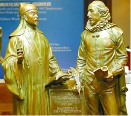 日前,记者来到有“才子之乡”美誉的抚州,寻访这位文学巨匠留下的印迹。在即将改造完成的汤显祖纪念馆的办公区域,一尊青铜双人塑像吸引了记者的目光——身着长衫、手握毛笔的汤显祖与一位手持鹅毛笔的异国人士相对而立,他们的目光,似乎穿越时空相互凝望。那位异国人士,是英国文学史上最杰出戏剧家、全世界最卓越文学家之一的莎士比亚。
