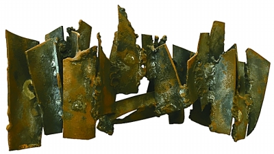 《笔架》这幅作品的材质仍然采用熊秉明先生自《嚎叫的狼》以来沿用的铁片造型。围绕“笔架”这一主题,他完全舍弃了雕塑的封闭性空间和巨大的立体式造型,转向一种开放式的、更为简单、纯粹的表达。环形带状的铁片相互错落地搭架在一起,有直立的、有横着的,高矮不一、参差有致,连焊接的印记也一并留存在作品之中,成为作品本身的一部分,从而使观者能够更加纯粹地感受材质以及造型带来的空间和美感。所以杨振宁先生说:“你不光看到他的铁片,而且铁片之间的空间也成为雕塑的一部分。”这种将雕像原有的巨大实体消解在空间中,使空间也成为雕塑造型甚至审美的一部分,显然是贯穿着熊秉明先生自身独特的思考在其中的。而杨振宁先生能如此敏锐地感受到熊秉明先生的创作意图,也正是他们七十余年的友情的最好见证。在艺术和科学之间,他们显然有许多共识,在许多方面也都有相同的文化情怀。