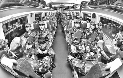 10日,入伍新兵乘坐高铁列车奔赴军营。此次330名应征入伍的新兵从山东烟台火车站乘坐G462次高铁列车前往军营。据了解,这是烟台铁路部门通过高铁一次性发送新兵数量最大的一次。 唐克摄/光明图片