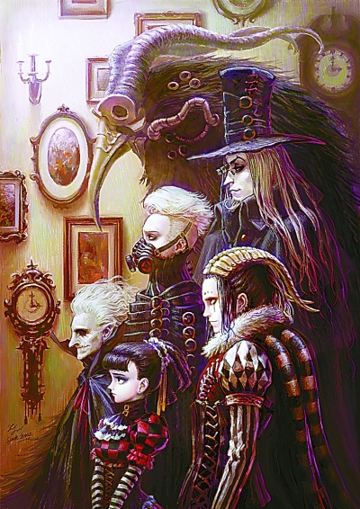 画面上方,头戴面具的“乌鸦先生”查尔斯是核心人物,他的服饰加入了大量蒸汽时代独有的元素,起到画面主要基调的支撑作用。大礼帽、黑色礼服,一副绅士打扮的是阿道夫,他沉默寡言、性格高傲,向往骑士精神。露西是画中唯一的女性,酷爱收藏人偶。站在露西后面一脸严肃的“小丑”杰克喜欢恶作剧,因此总是受到孩子们的欢迎。为了凸显人物性格,杰克的设计结合了宫廷服饰和舞台装饰,但色调的饱和度控制在了画面整体气氛之中。画中6位神秘房间的缔造者心怀对人性的浓厚兴趣和敬畏之情,每年他们都会从世界各处赶来,观看并研究这一年中房间所收集的人们内心的悲欢离合。