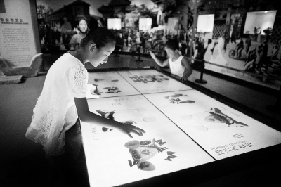 在山东省滨州市文化馆非物质文化遗产展示厅内,多项虚拟新技术的应用正助力非遗科普展。通过触摸屏上的操作,可以进行虚拟拼图、虚拟剪纸、虚拟绘色等项目,让人身临其境感受别样体验。高立萌摄/光明图片