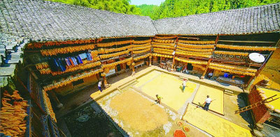 日前,重庆市丰都县南洋村的村民们在晾晒收获的谷子、玉米等农作物,准备入库存放。