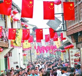 国庆节,江苏省苏州市山塘古街上悬挂数千面国旗,庆祝新中国67岁生日。图为10月1日,游人在国旗招展的苏州山塘古街上游玩。王建康摄/光明图片