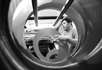 10月6日,山东宏盛橡胶科技公司生产车间操作工正在进行轮胎胎胚成型工序的操作。据悉,该公司成立了专门的研发中心,生产涵盖越野车胎、雪地胎等多个系列的高端轮胎。刘新武摄/光明图片