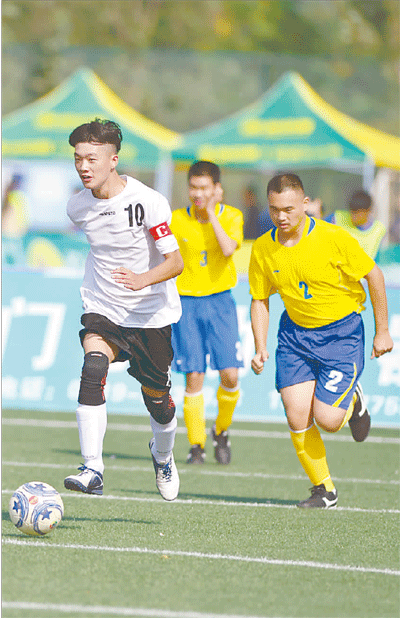 10月10日,2016年全国青少年校园足球特奥融合组总决赛(五人制)在河北省邢台市开赛。20个省的21支代表队、205名运动员进入决赛。图为上海队10号队员吴超在比赛中带球。陈雷摄/光明图片