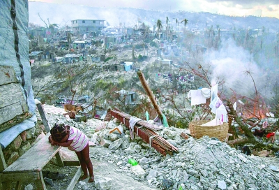 10月10日,在海地热雷米,一名儿童在废墟旁休息。据海地民防局10日公布的最新数据,飓风“马修”已造成至少372人死亡、246人受伤。超过17万人被迫离开家园,目前居住在临时避难所。 新华社发(联合国儿童基金会供图)