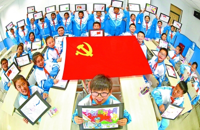 10月19日,河北省秦皇岛市海港区先盛里小学开展“制作红色手抄报”纪念长征胜利80周年主题班队会,通过让小学生动手绘制手抄报的形式,弘扬伟大长征精神,缅怀先烈丰功伟绩,描绘对现代生活的美好祝福。图为学生展示手抄报。曹建雄摄/光明图片