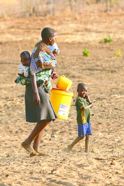 11月3日,在津巴布韦鲁辛加地区的尼亚马索塔村,一名妇女带着孩子来水井取水。鲁辛加的水井项目,是中国向津巴布韦援建水井项目的一部分。为缓解干旱和缺水对津巴布韦农村地区民众的影响,2012年以来,中国政府出资为津巴布韦援建500口水井,工程分为3期,由江西国际经济技术合作公司承建。现在正在进行的工程是第3期工程,共300口水井。工程于去年年底开工,计划于2017年完工。