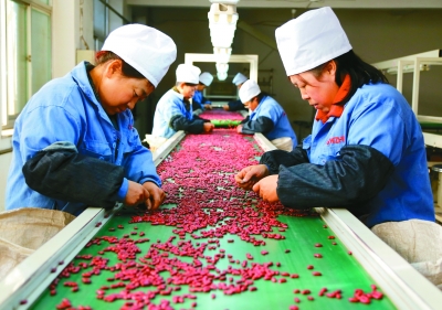 五寨县及邻近周边地区具有杂粮种植的优势条件,红芸豆是其龙头产品。从2003年起,五寨县汇丰贸易有限公司购销、生产、加工红芸豆80000余吨,其中出口38000余吨,累计创汇约3000万美元,带动10000余户农业人口增收致富。图为流水线工人挑拣、加工红芸豆。本报记者 马列摄/光明图片