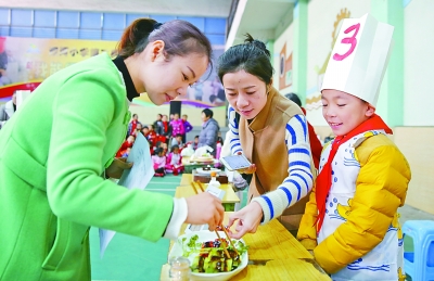 11月14日,四川省华蓥市双河小学举行第二届“生活自理能力展示活动”,1000余名小学生分年级参加了厨艺、打扫卫生等日常生活技能展示。双河小学将家庭服务、手工、厨艺等基本生活技能教育引进课堂,并进行考核评比,以此提高小学生的生活自理、团结协作、创新能力。图为两名应邀参加的家长,在品尝小学生制作的凉菜。游青摄/光明图片