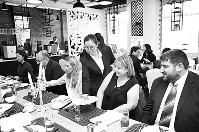 11月3日中午,真正的宴会开始了。“剧情”进入高潮,同学们一个个化身为“专业的星级员工”:优雅的动作、温馨的微笑、用英语自信交流,客人们时刻感受到组织者的独具匠心。“整个过程都在微笑”“特别有礼貌”“摆台很漂亮”“你们的服务是五星的”“希望你们做自己喜欢做的事情,在这个行业里继续做下去”……13位英国嘉宾站在“客户”的角度,对同学们既称赞又鼓励。