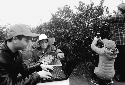 11月10日,在江西省南丰县洽湾镇洽湾村橘园内,党员志愿者在为橘农收获的蜜橘拍照、发布交易信息。为帮助橘农拓宽销售渠道,江西省南丰县结合“两学一做”学习教育,组织党员志愿者组成“义工服务队”,通过淘宝、微信等平台,为当地橘农发布销售信息,提高收入。袁智摄/光明图片