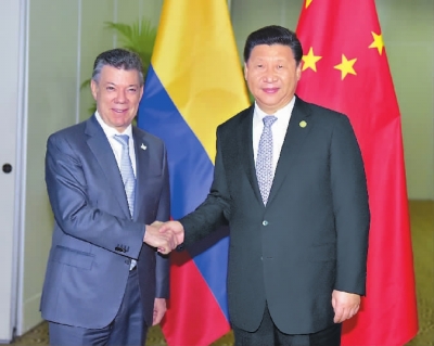 11月19日,国家主席习近平在利马会见哥伦比亚总统桑托斯。 新华社记者 李涛摄