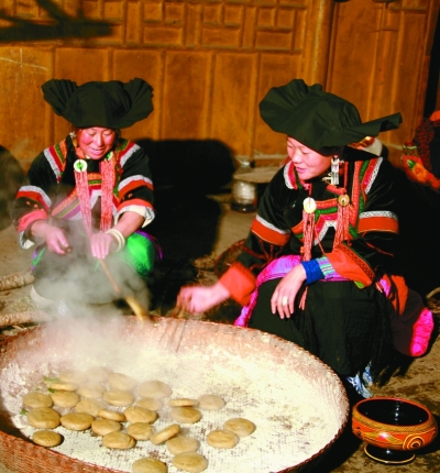 饭后,吉觉阿普家分成两个组,各自忙开来:吉觉阿妈和阿果抓紧在“波良”(拜年)队伍到来之前装完香肠;吉觉阿普和乌合抓紧腌制腊肉,以便参加“波良”队伍去四处“波良”。